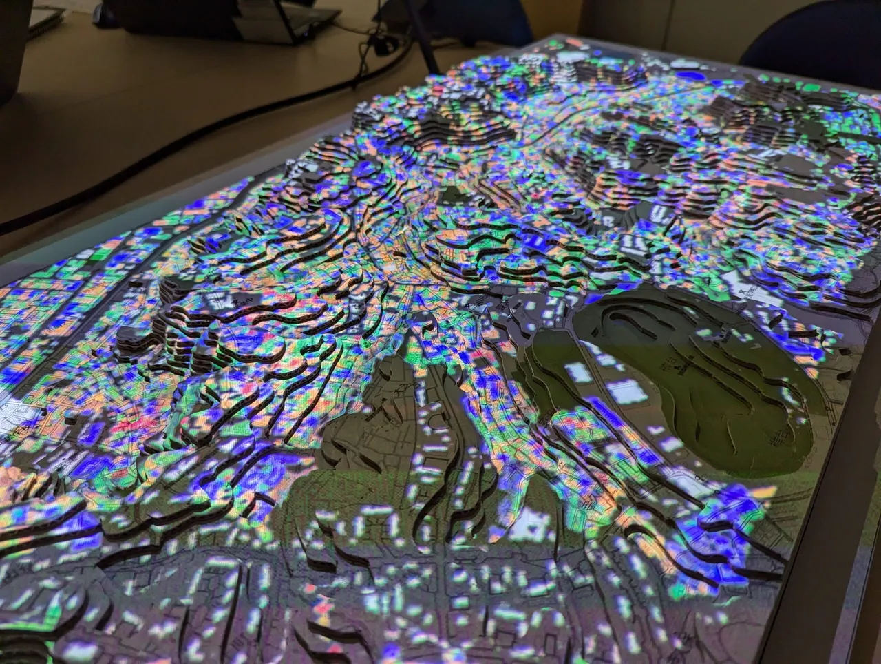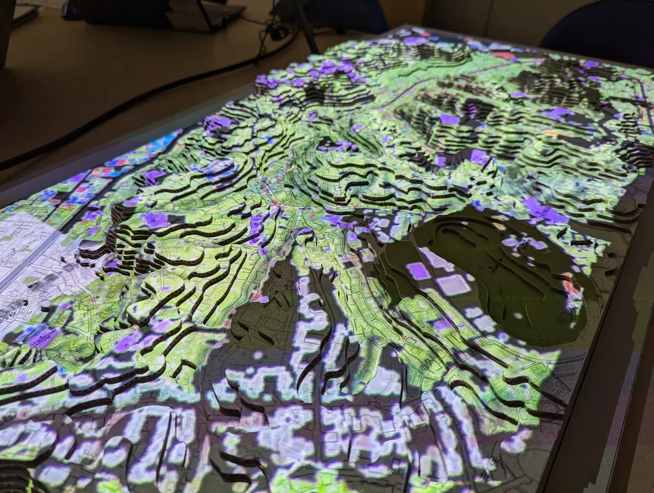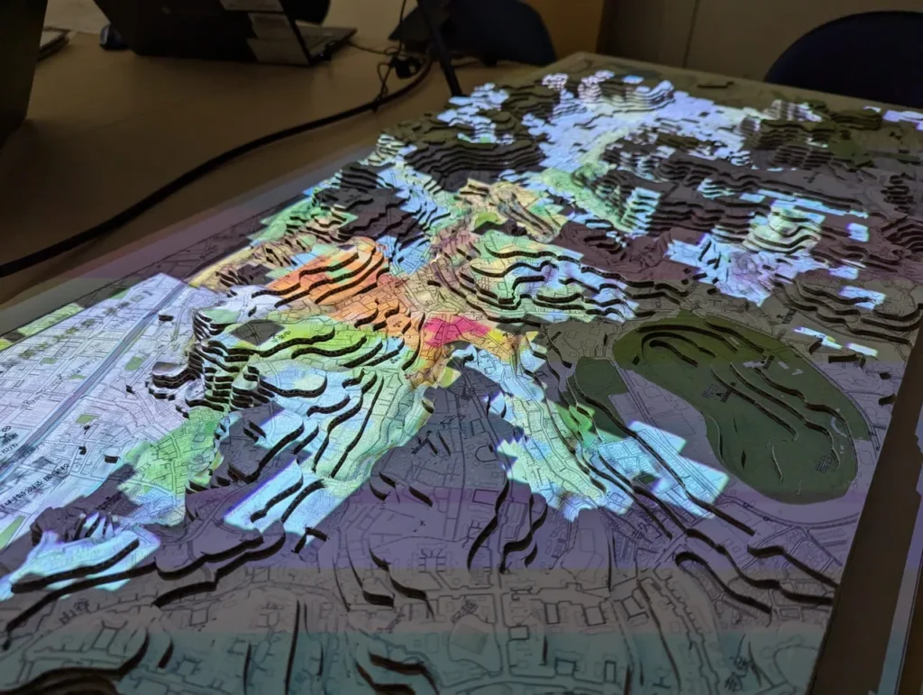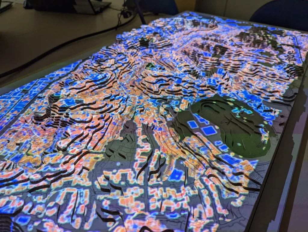 今回製作した「GISジオラマ」は、この段ボールジオラマに、延焼シミュレーション等の地域の様々な情報を投影して、地域の地形や災害リスクを立体的にわかりやすく可視化するツールです。
