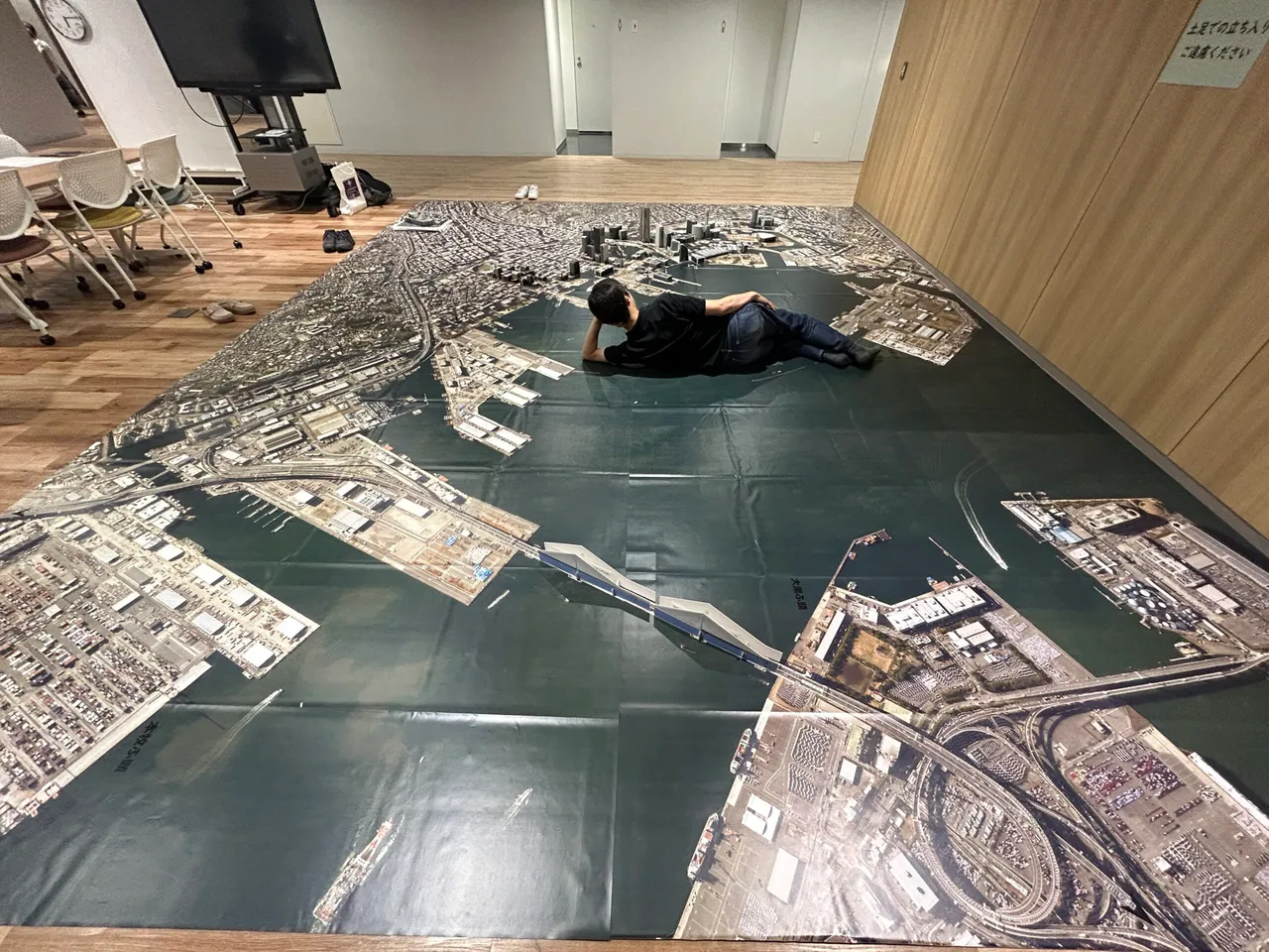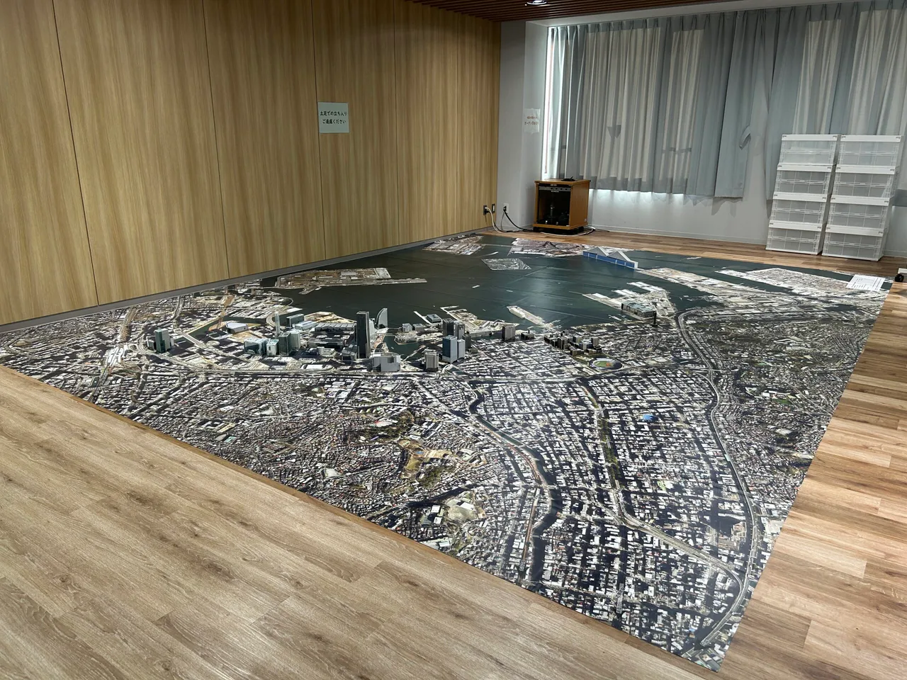 今回、國學院大學観光まちづくり学部より依頼を受け、横浜の観光まちづくりをテーマとしたスタジオ演習で用いるための、巨大な都市模型を作成しました。この模型は、PLATEAUで公開されている衛星写真を活用したもので、縮尺は1000分の1、サイズは縦5m×横6mの巨大模型です。