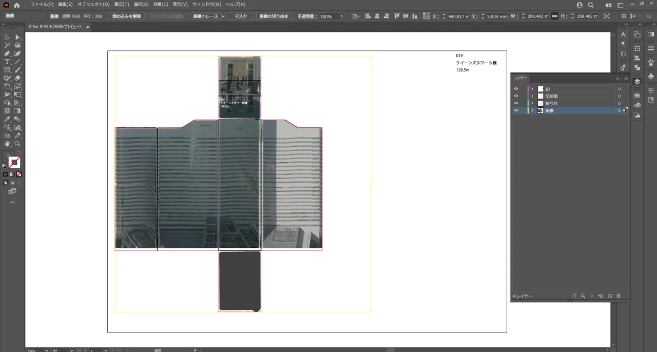 さらに、主要施設の模型製作にも、PLATEAUの3D建物データ(ファサード)を活用しています。これは、3Dモデル作成アプリ(使用アプリ:Blender)を用いて、ファサードをUV展開し、illustratorで印刷用データに編集、レイザーカッターを用いて模型切り出しを行っています。